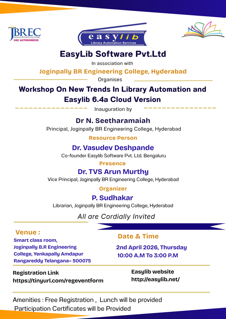 EasyLib Workshop on 2nd April 2026 at Joginpally B.R Engineering College, Hyderabad
